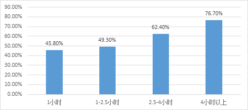 疫情期间近视发生与电子产品使用时长呈显著正相关,电子产品使用时间越长,发生近视可能性越大。据调查,疫情之前,学生上网课大多是参加校外培训机构学习。疫情期间,80.0%的学生每天都上网课,每天网课时间超过2.5小时的占47.9%。调查结果显示,每天2.5-4小时近视检出率是49.3%;每天上网课2.5小时到4小时,近视检出率是62.4%;每天上网课超过4小时,近视检出率是76.7%。